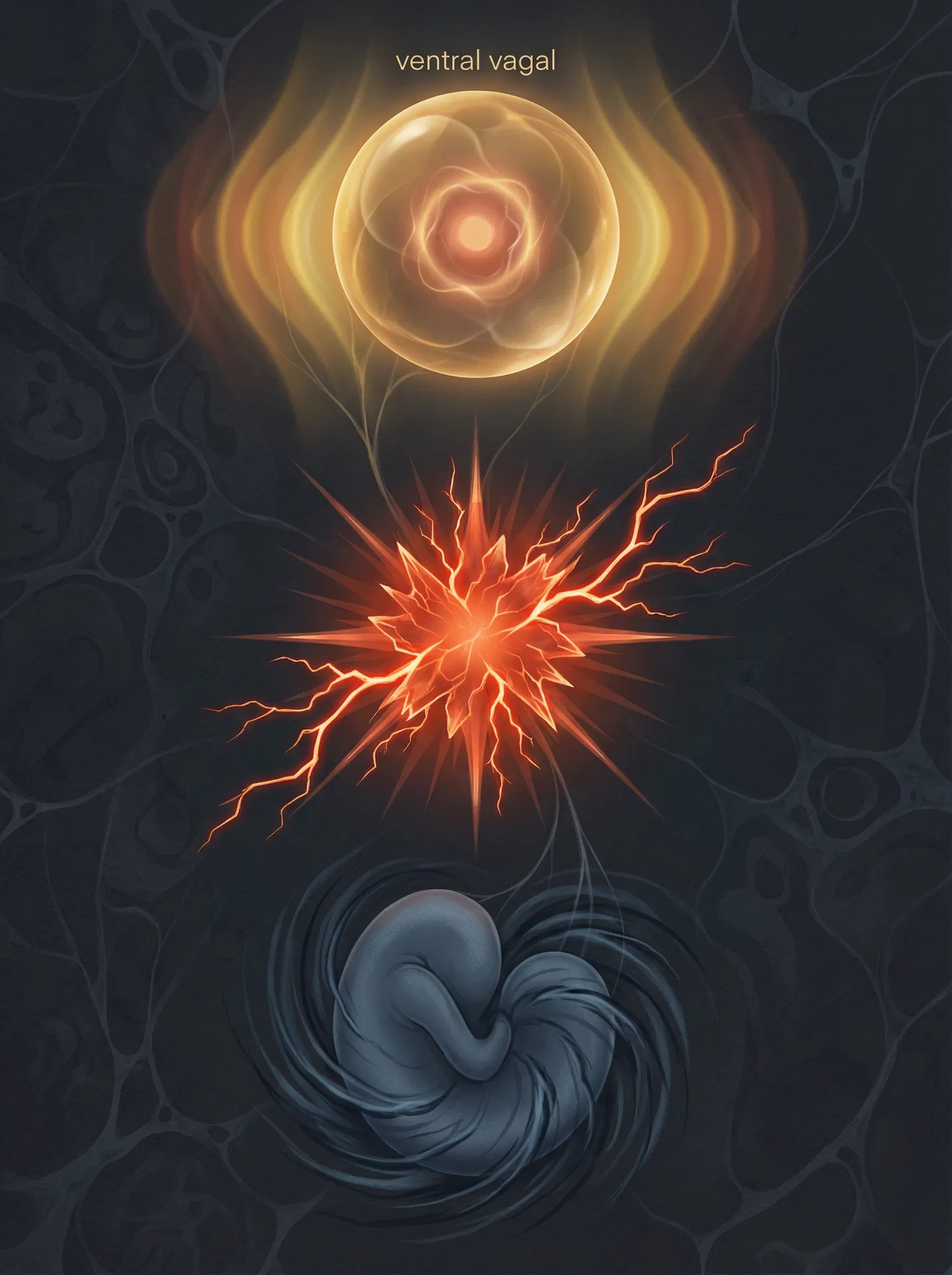 The dorsal vagal state is mediated by the older, unmyelinated branch of the vagus nerve — shared with reptiles. This is the most primitive survival response. When the nervous system determines that the threat is overwhelming and cannot be escaped through fight or flight, it drops to the bottom of the ladder into shutdown. This is the freeze, collapse, or dissociation response. It evolved as a last-resort survival mechanism — playing dead to survive a predator.